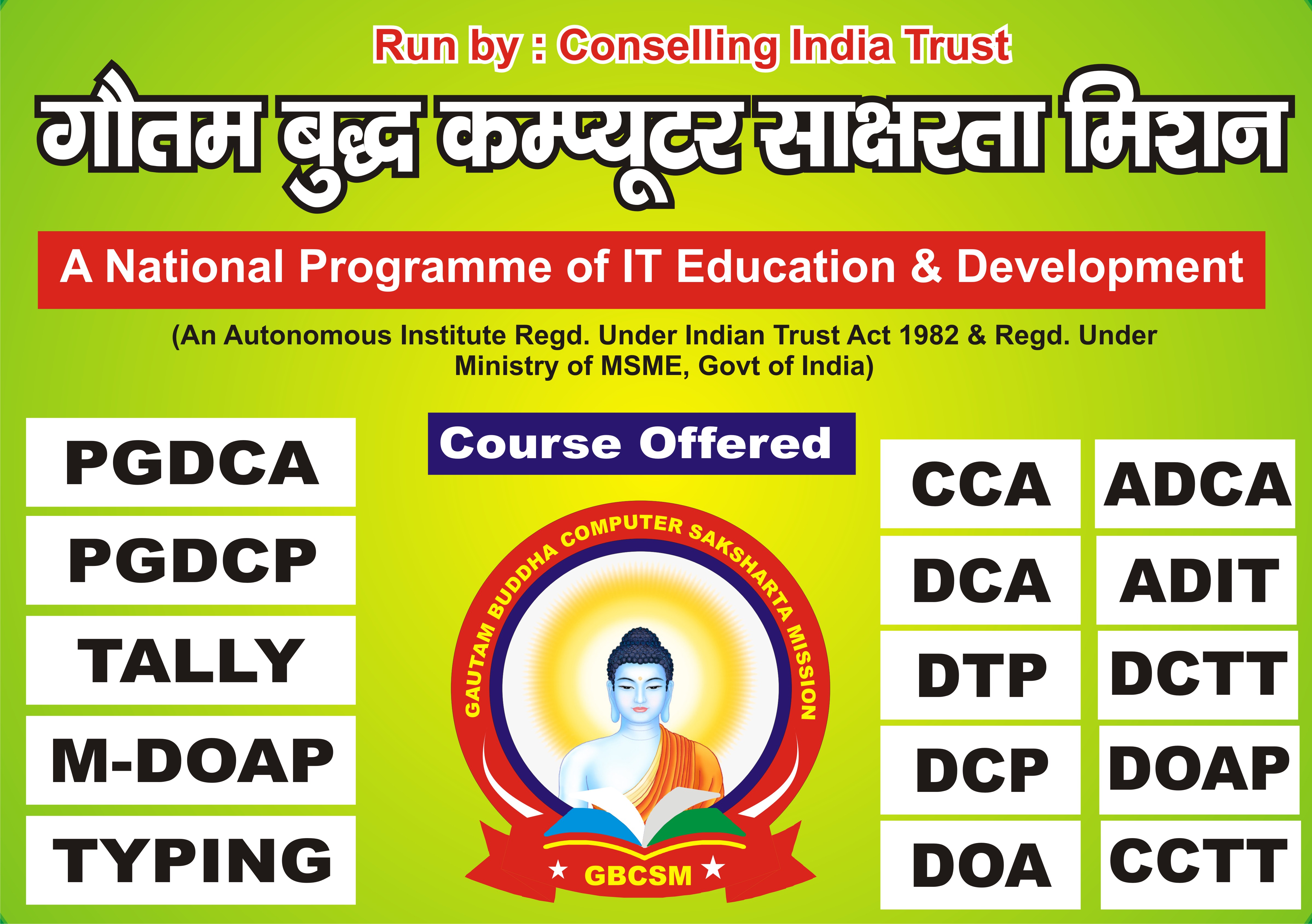 Gautam Buddha Computer Sakshatra Mission having the An Autonomous Body Regd. Under Govt. Of UP REG NO. IV-7/20 based On Indian trust Act.1882, Govt. Of India, empanelled Under: